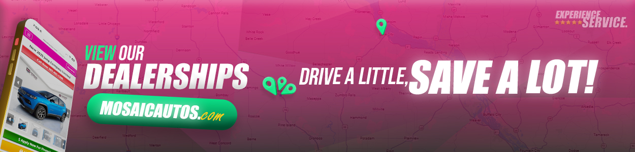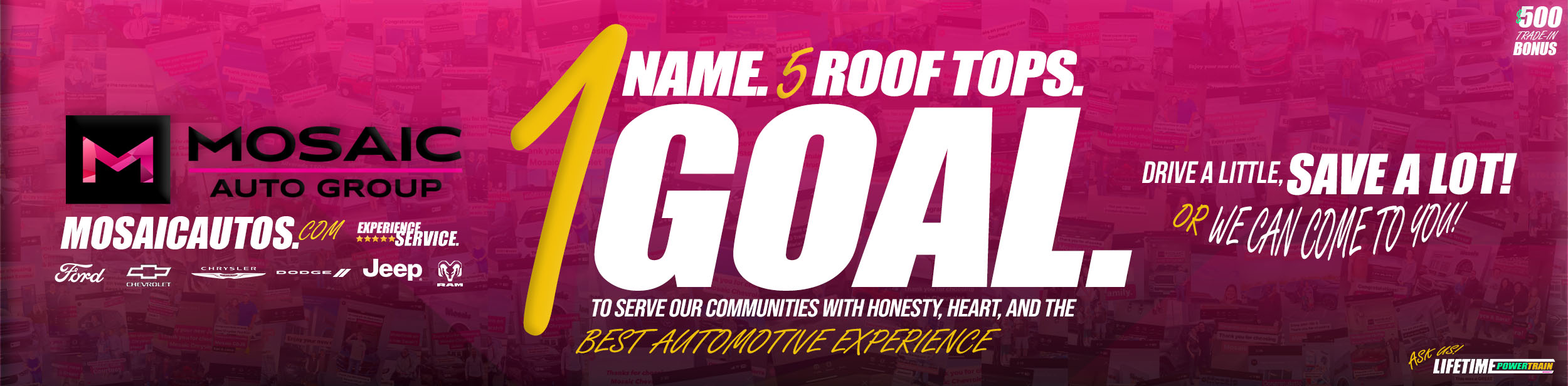 At Mosaic Auto Group, our promise is simple: to deliver the same hometown care and personalized experience you’ve always known, backed by a commitment to transparency, trust, and 5-star service with every interaction. Because for us, “Beyond sales, it’s service” isn’t just a saying, it’s who we are. One name. Five rooftops. One goal. To serve our communities with honesty, heart, and the best automotive experience possible. Experience the Mosaic difference, drive a little, and save a lot today!