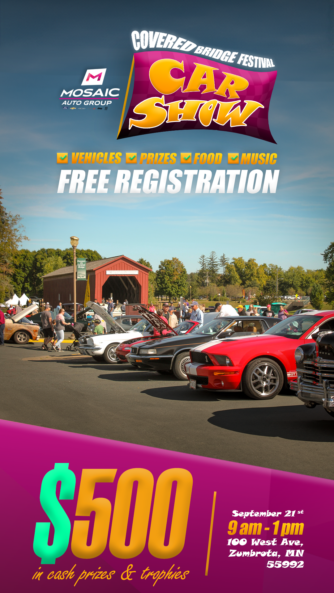 The excitement doesn’t stop at the car show! The top two winners will have their vehicles featured alongside the Mosaic Auto Group team in the Zumbrota Covered Bridge Festival Parade on Sunday, September 22nd at 3 PM.